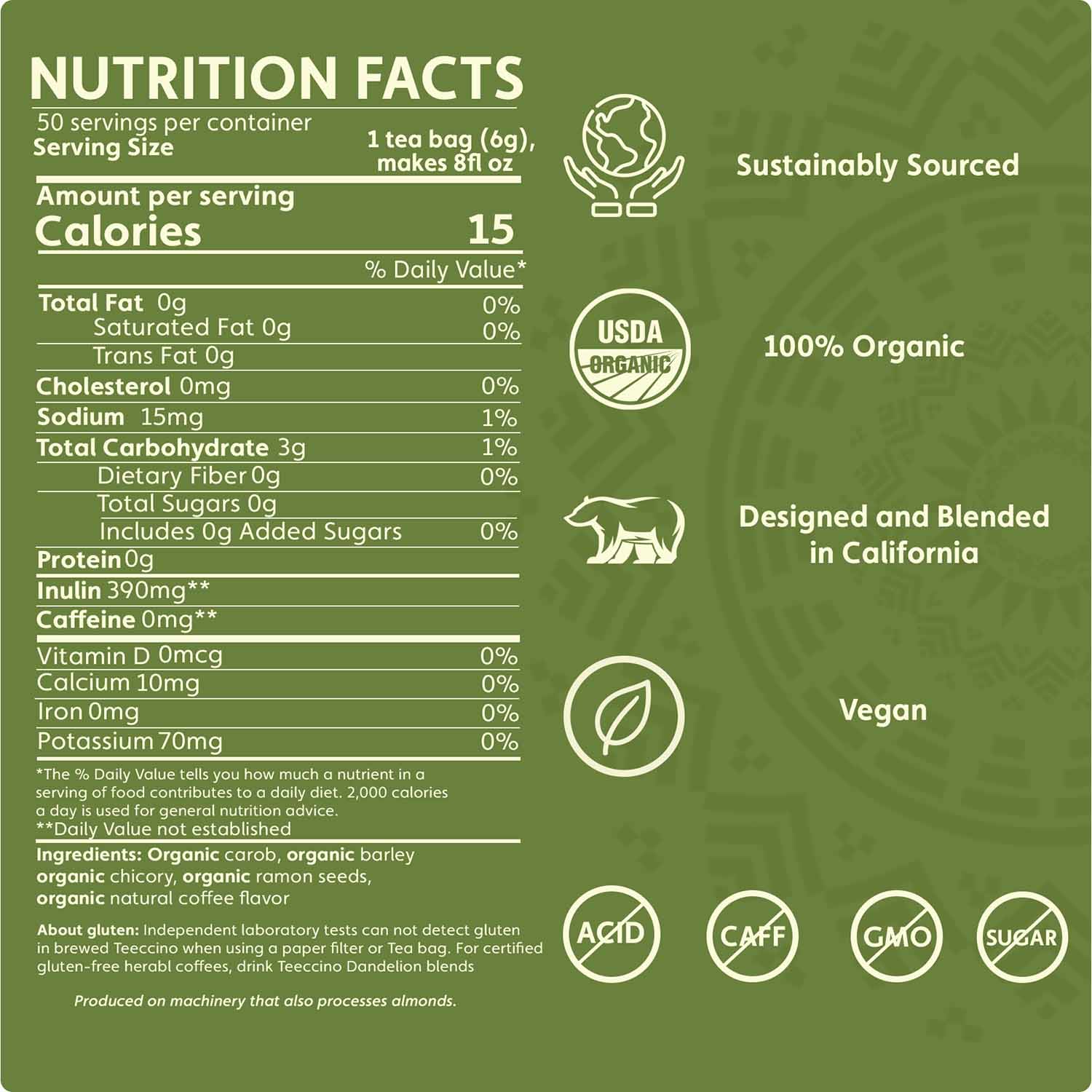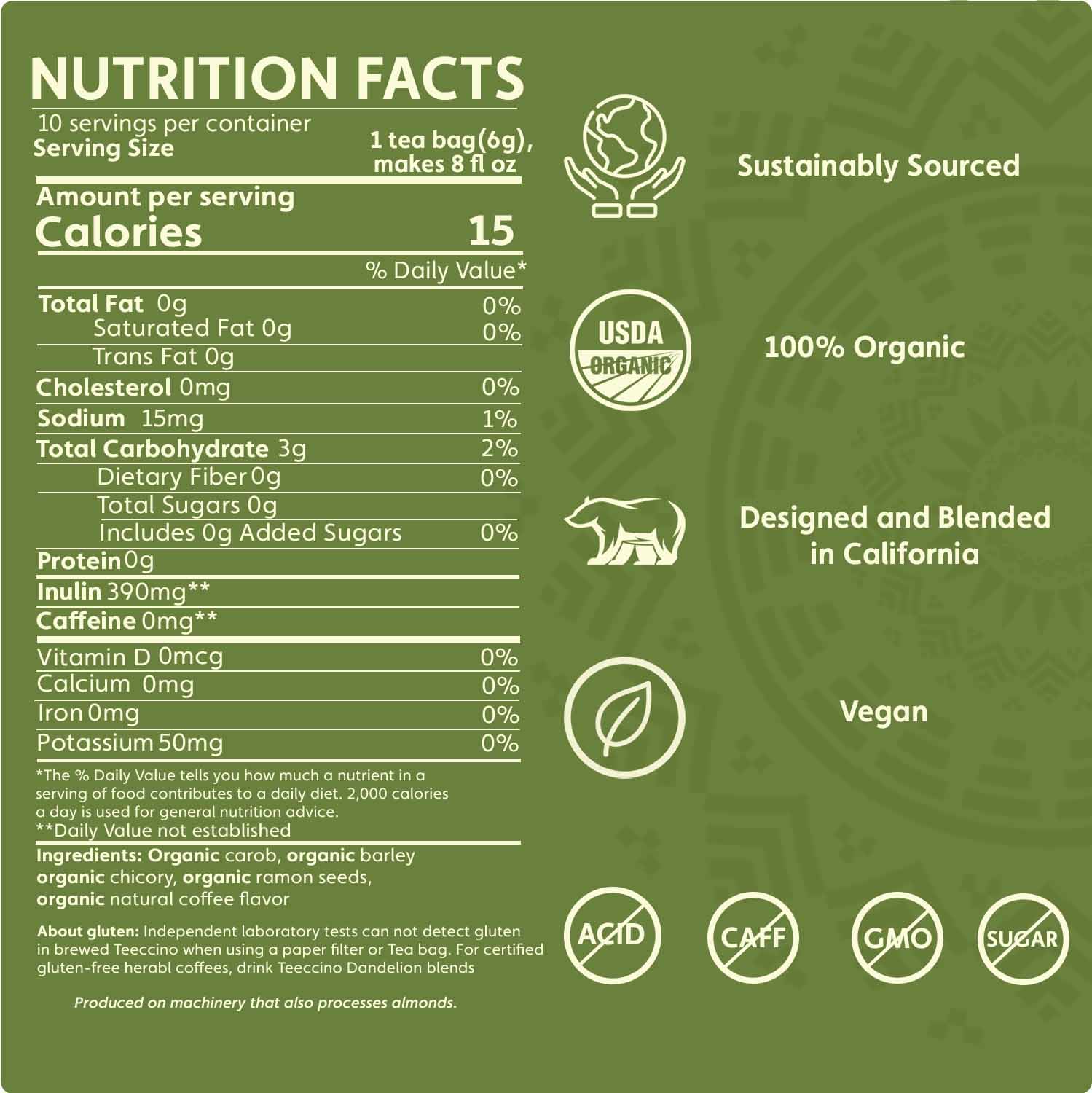 Intense deep coffee notes from roasted ramón seeds and chicory roots create a robust, focused body without any sweetness.